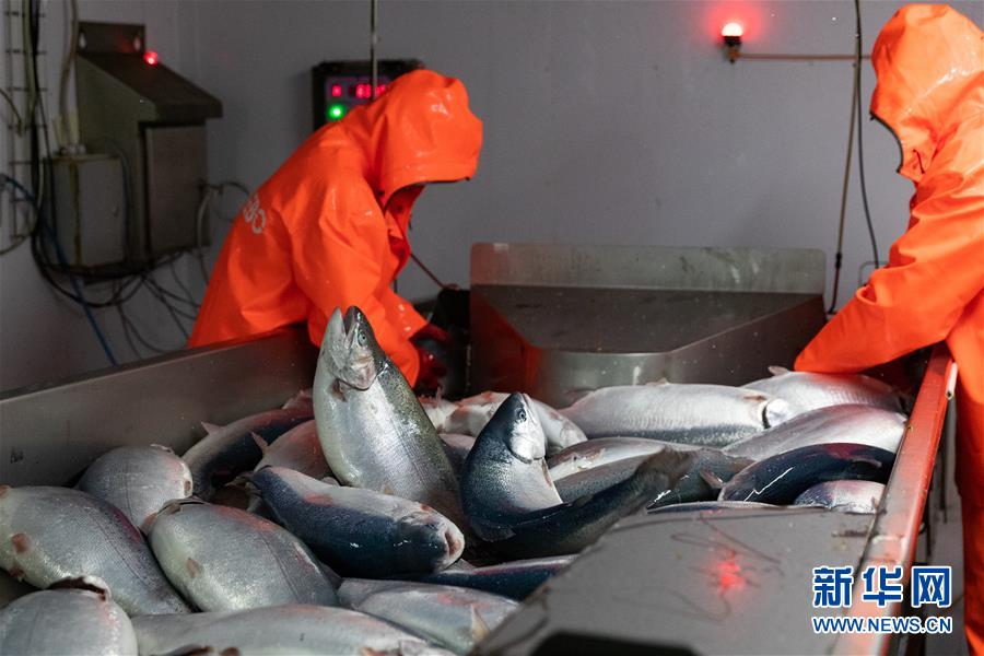 9月13日,在俄罗斯摩尔曼斯克,俄罗斯水产养殖公司工作人员在车间处理鲑鱼。 新华社记者白雪骐摄
