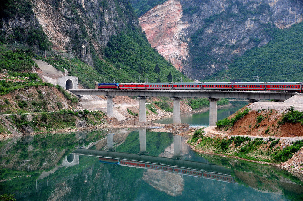 2009年5月8日,甘肃徽县,一列货物列车安全通过宝成铁路新109号隧道。在汶川地震中损毁后新建的宝成铁路新109号隧道开通半年以来,已安全通过客货列车2万多列,为四川灾后重建提供了坚实的运输保障。唐振江/视觉中国