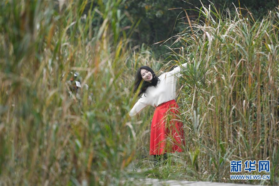 11月3日,游客在西溪湿地欣赏芦花时留影。 正值深秋,浙江杭州西溪湿地国家公园进入赏芦佳季。 新华社记者 黄宗治 摄