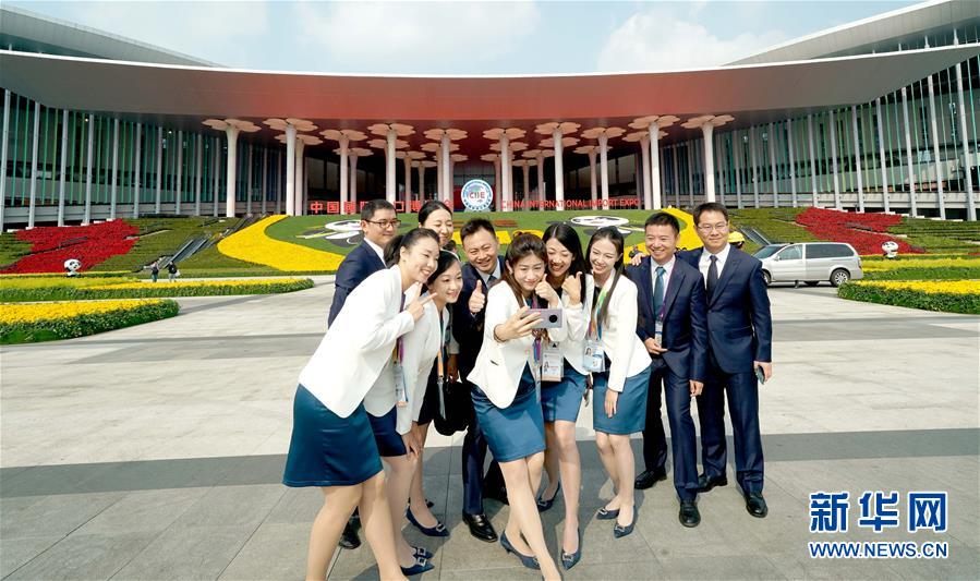 11月4日,第二届中国国际进口博览会中国馆的工作人员在国家会展中心(上海)南广场合影。新华社记者 陈建力 摄