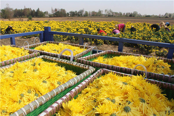 2019年11月1日,湖北省孝感市,云梦县清明河乡三港村村民在村民刘云香的菊花地里采摘盛开的菊花。