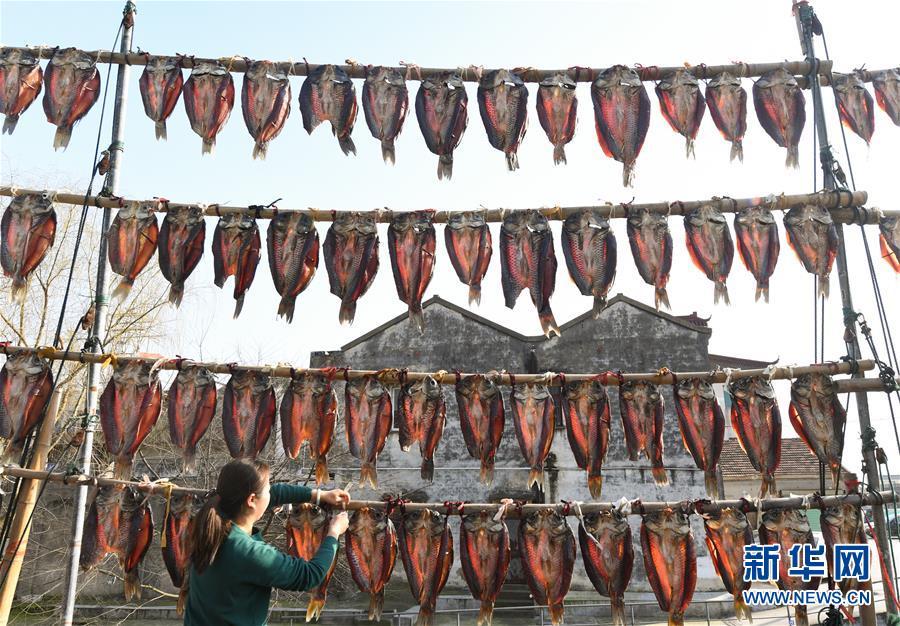 3月12日,浙江省湖州市吴兴高新区幻溇村村民在晒鱼干。近日,太湖南岸湖州地区久雨初晴,渔民忙着制作、晾晒鱼干。新华社记者翁忻旸摄