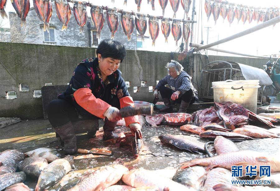 3月12日,浙江省湖州市吴兴高新区幻溇村村民在剖鱼准备腌制鱼干。近日,太湖南岸湖州地区久雨初晴,渔民忙着制作、晾晒鱼干。新华社记者翁忻旸摄