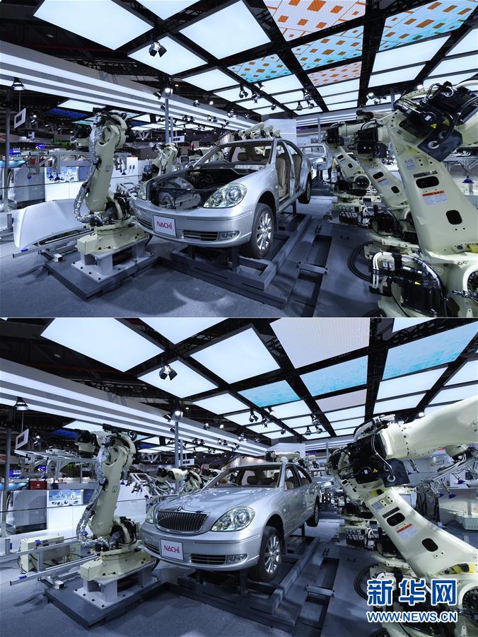 11月5日在第二届进博会装备展区日本那智不二越公司展台拍摄的超高速点焊SRA系列机器人。当日,第二届中国国际进口博览会在上海国家会展中心开幕。新华社记者王鹏摄
