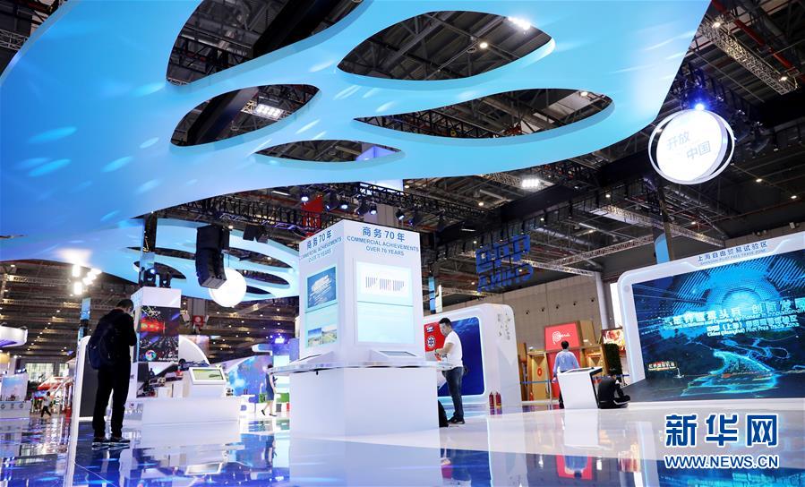 11月5日在上海国家会展中心拍摄的第二届进博会服务贸易展区(全景相机拍摄)。新华社记者尹炣摄