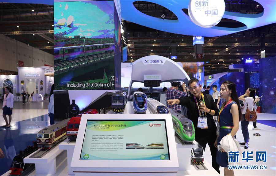 11月2日,在第二届中国国际进口博览会国家展展区内的中国馆,工作人员在一组中国铁路展品旁讨论交流。新华社记者方喆摄