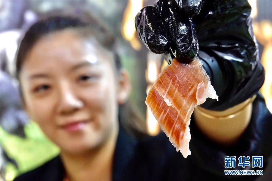 11月5日,在第二届进博会食品及农产品展区,工作人员展示西班牙橡果火腿。新华社记者才扬摄