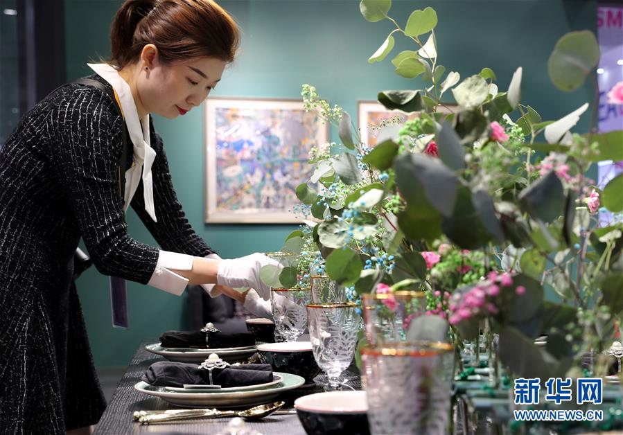 11月5日,在第二届进博会品质生活展区,工作人员在一家丹麦家居产品的展台前忙碌。新华社记者刘颖摄