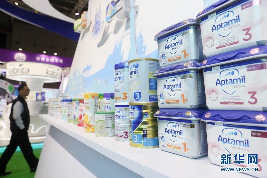 11月5日,在第二届进博会食品及农产品展区,参观者从达能展台经过。新华社记者丁汀摄