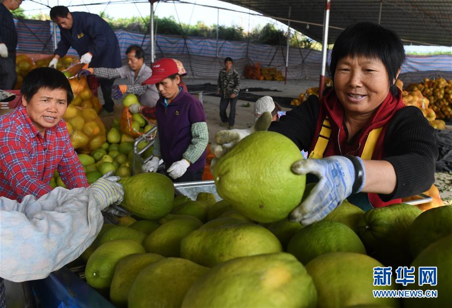 11月5日,村民在广西罗城仫佬族自治县金玉柚生态产业扶贫示范区分拣柚子,准备装车外销。 新华社记者 陆波岸 摄