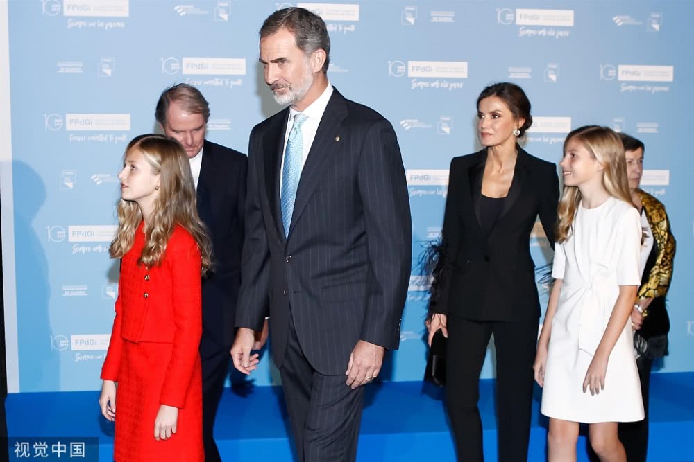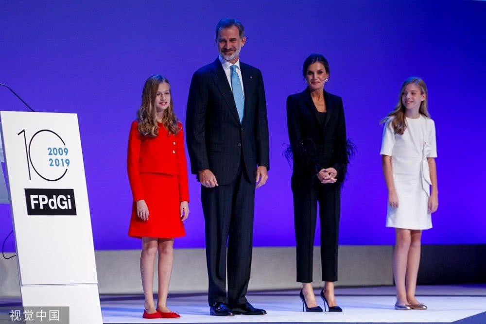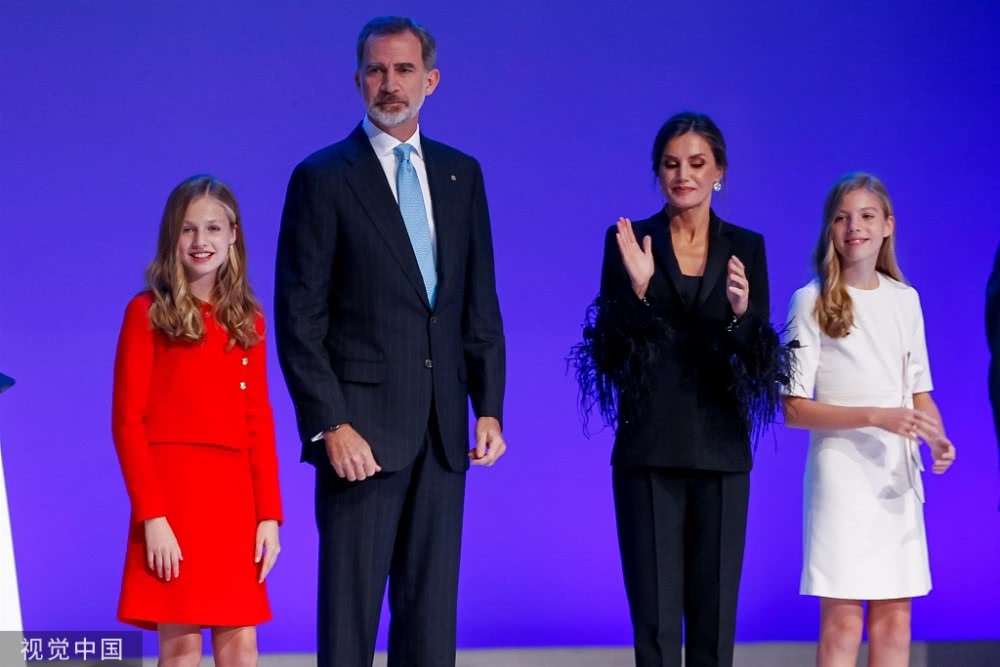 当地时间2019年11月4日,西班牙巴塞罗那,费利佩六世(Felipe VI of Spain)和莱昂诺尔公主(Princess Leonor)等皇室成员现身参加“赫罗纳公主基金奖”。