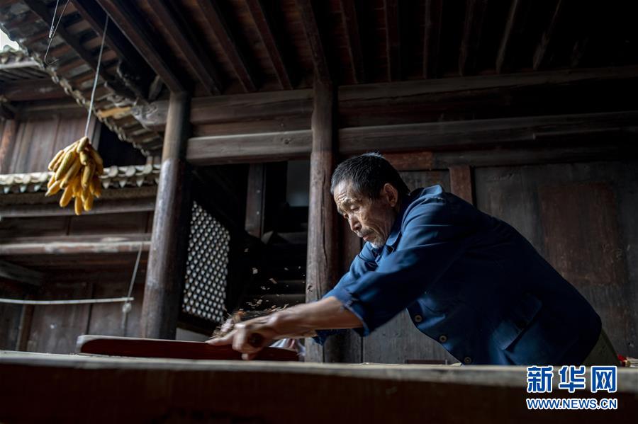 73岁的石屏县异龙镇符家营村村民杨国保在家中制作村里修整老屋所需的木梁(8月8日摄)。新华社记者江文耀摄