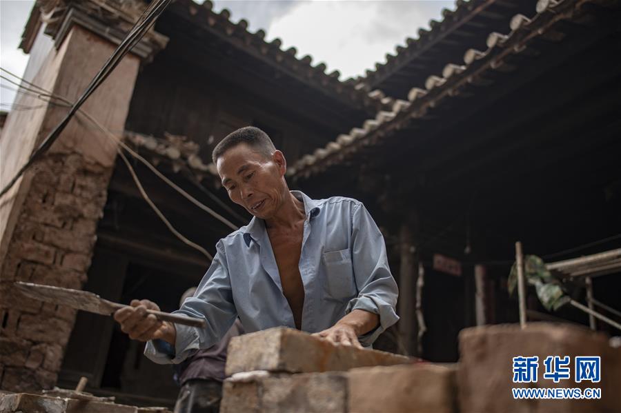 工人王建雄在修缮石屏县异龙镇符家营村189号民居的围墙(8月8日摄)。新华社记者江文耀摄
