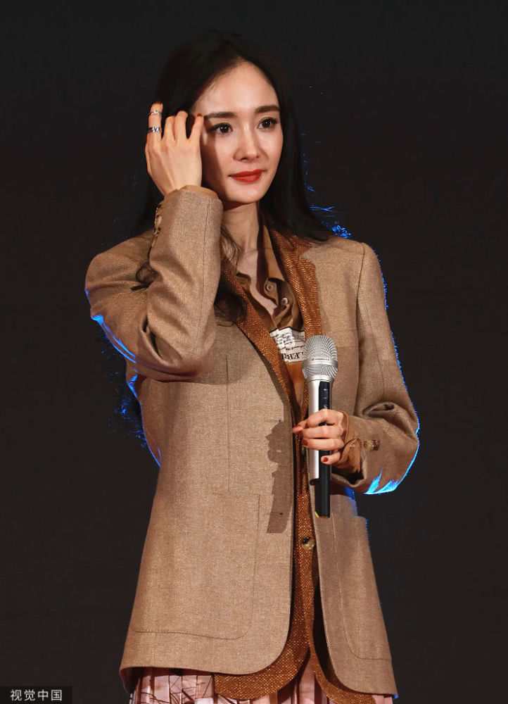 她穿奶茶色西装温温柔柔,混搭简单长裙秀别样时尚,认真讲话尽显睿智,频频撩卷发露浅笑,女人味十足。