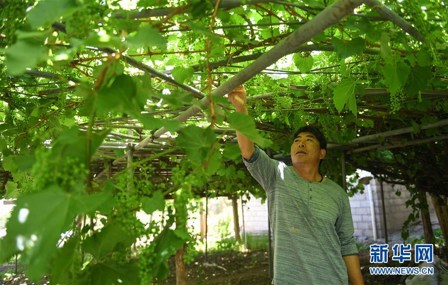 建厂生产并注册“丁德良”牌干红葡萄酒品牌的鲁仁弟介绍他家里一棵树龄超过百年的葡萄树(6月3日摄)。新华社记者晋美多吉摄