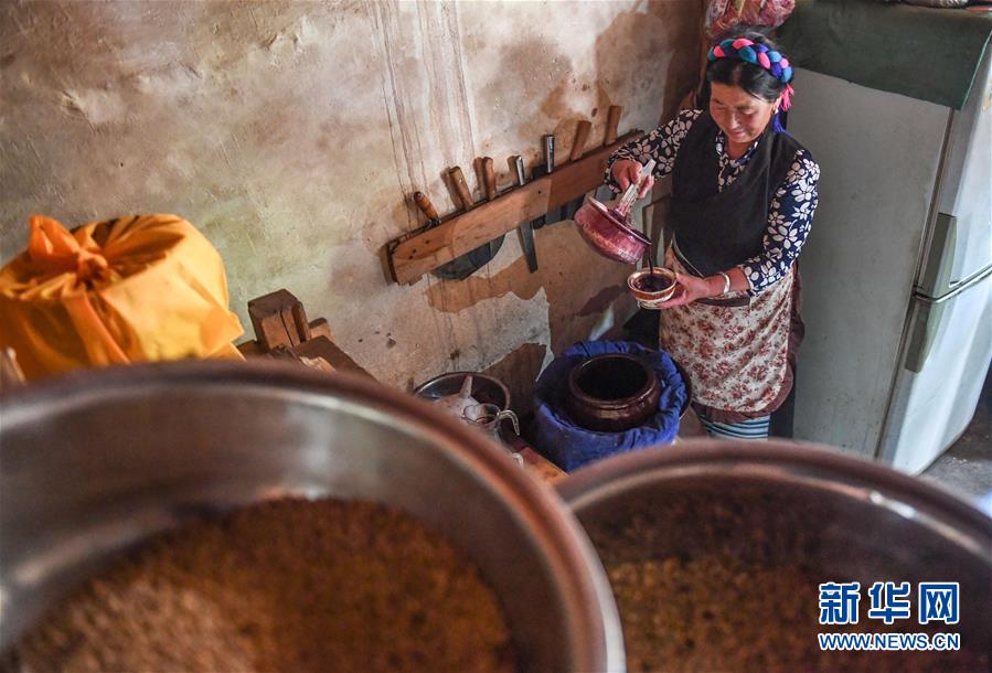 西藏昌都市芒康县纳西民族乡村民在自家酿造葡萄酒(6月3日摄)。新华社记者晋美多吉摄