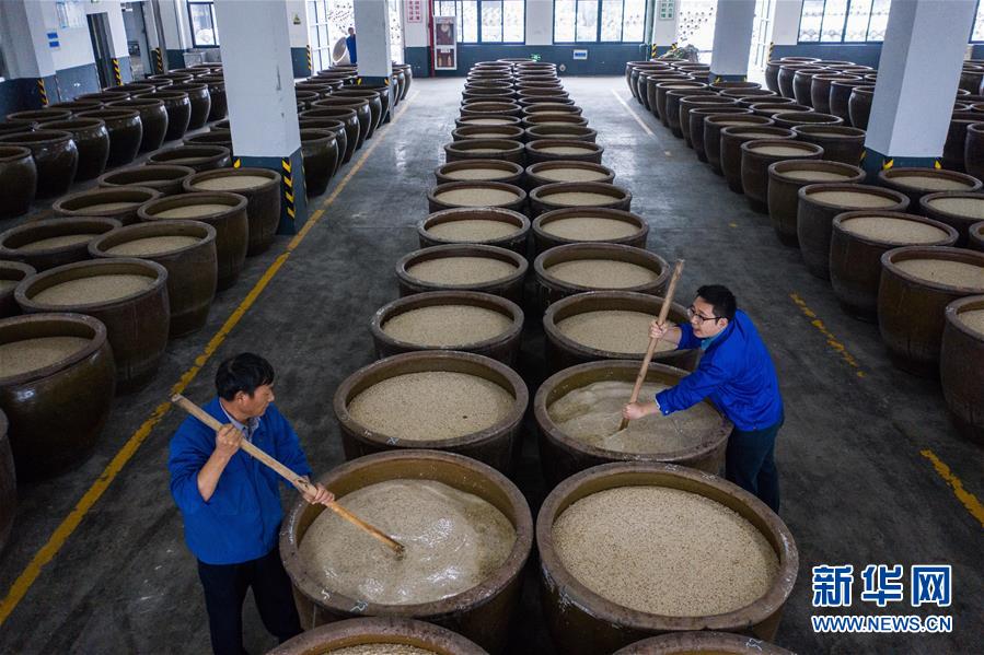 11月7日,古越龙山绍兴酒股份有限公司酿酒一厂的工人进行“开耙”搅拌(无人机拍摄)。新华社记者徐昱摄