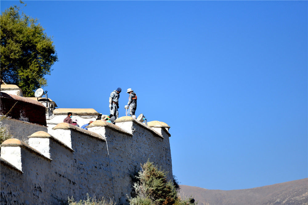 2019年11月06日,西藏拉萨布达拉宫“换装季”,两位工人在高空作业。
