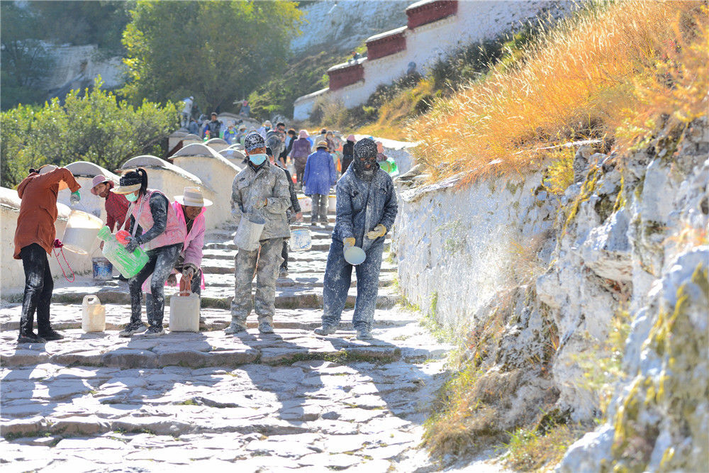 2019年11月06日,西藏拉萨,民众粉刷布达拉宫的步道。