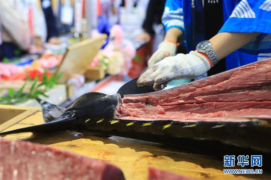 11月7日,来自日本长崎鱼市株式会社的专业切鱼师傅在现场解体70公斤蓝鳍金枪鱼。第二届中国国际进口博览会正在上海国家会展中心举行。博览会的食品及农产品展区里汇集了来自世界各地的美食,同时也上演各种精彩美食秀。11月7日,来自日本长崎鱼市株式会社的专业切鱼师傅现场解体一条70公斤的蓝鳍金枪鱼,吸引大量参观者观看、品尝。新华社记者隋先凯摄