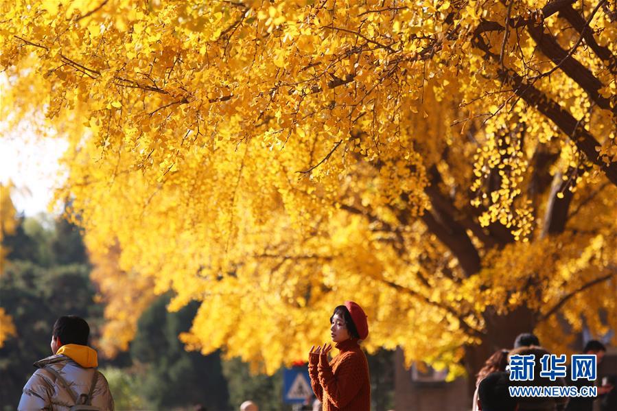 11月7日,一名女生在清华大学清华路上留影。