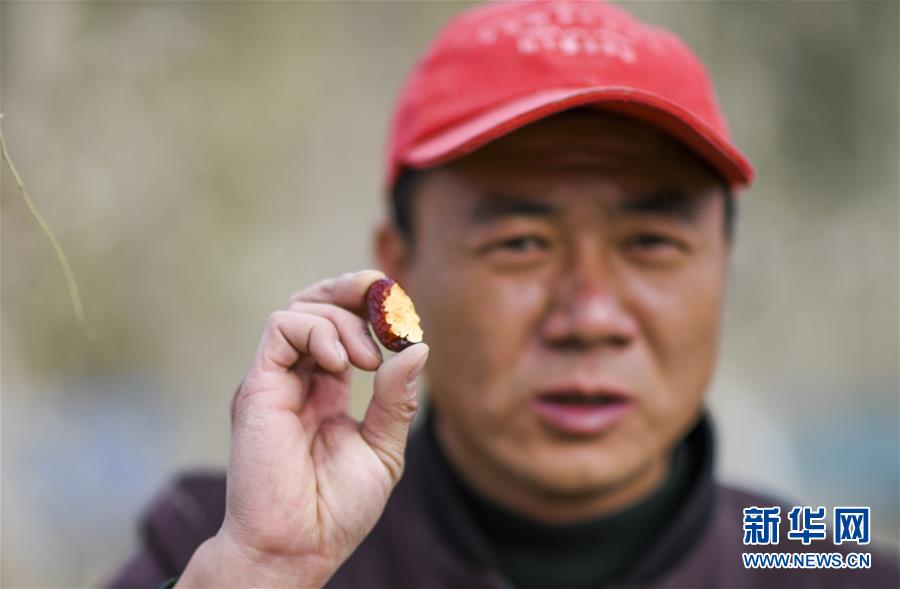 陈晓明在介绍红枣如何分级(10月29日摄)。新华社记者赵戈摄