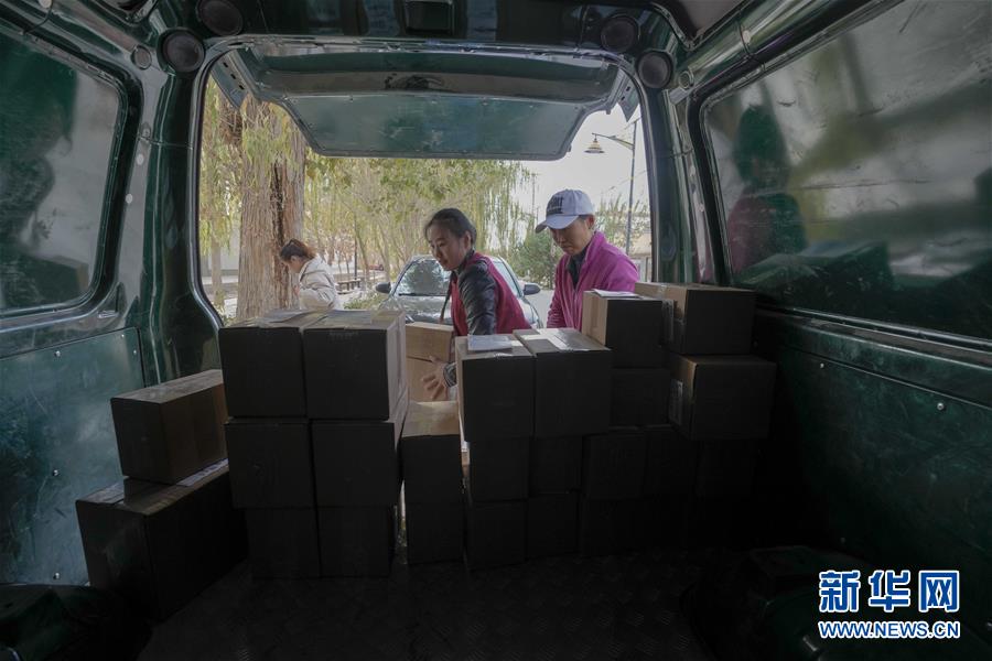陈晓明的妻子王慧(右)将打包的红枣放到快递车上(10月29日摄)。新华社记者赵戈摄