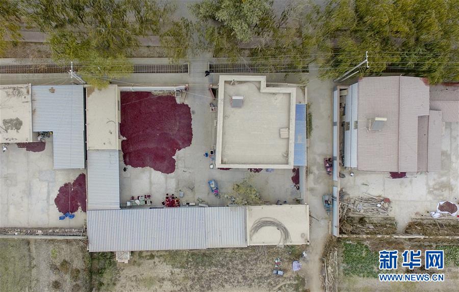 这是从空中俯瞰陈晓明的院子中已经收获了不少红枣(10月29日无人机拍摄)。新华社记者赵戈摄