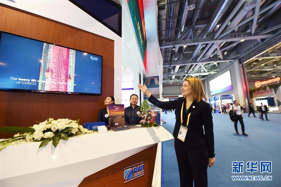 这是在第二届进博会上拍摄的希腊比雷埃夫斯港展台(11月8日摄)。新华社记者尹炣摄