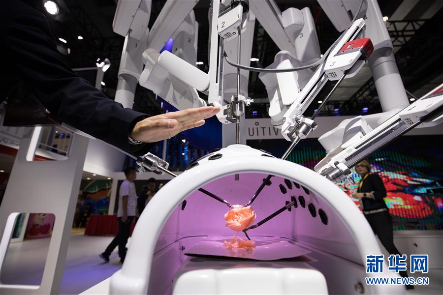 这是在第二届进博会医疗器械及医药保健展区拍摄的机器人辅助腹腔镜手术系统(11月7日摄)。新华社记者金立旺摄