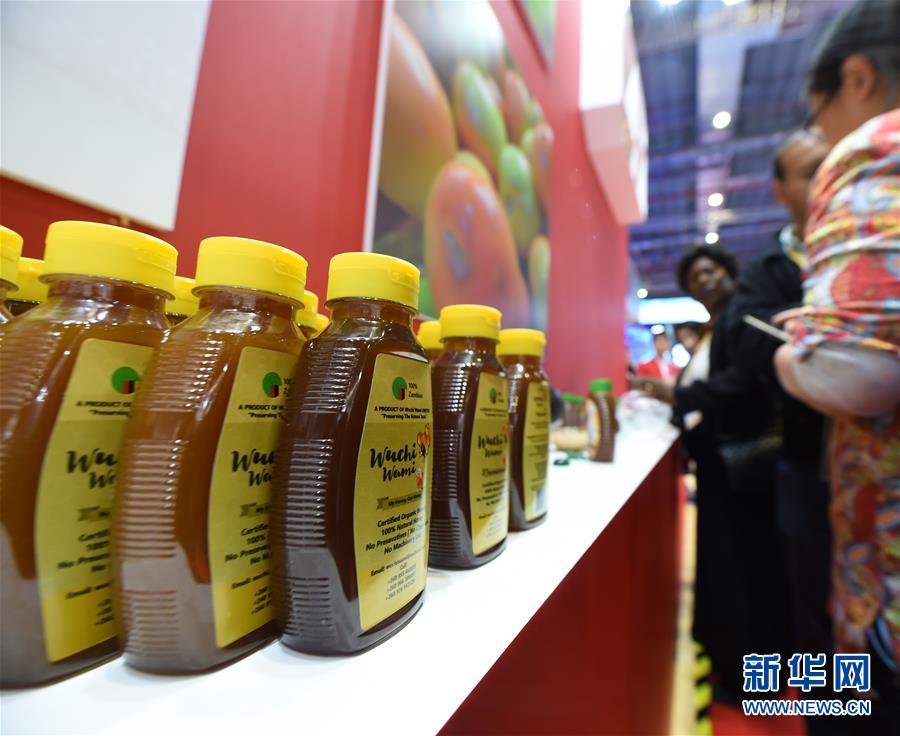参观者在第二届进博会上了解赞比亚蜂蜜(11月6日摄)。新华社记者尹炣摄