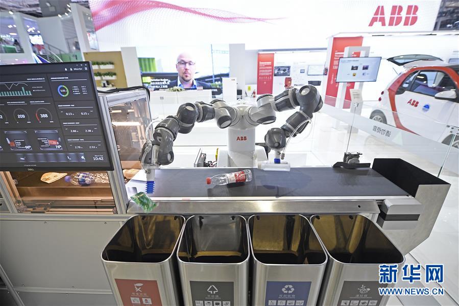 第二届进博会瑞士ABB集团展出的人机协作双臂机器人YuMi在进行垃圾分类演示(11月5日摄)。新华社记者王鹏摄
