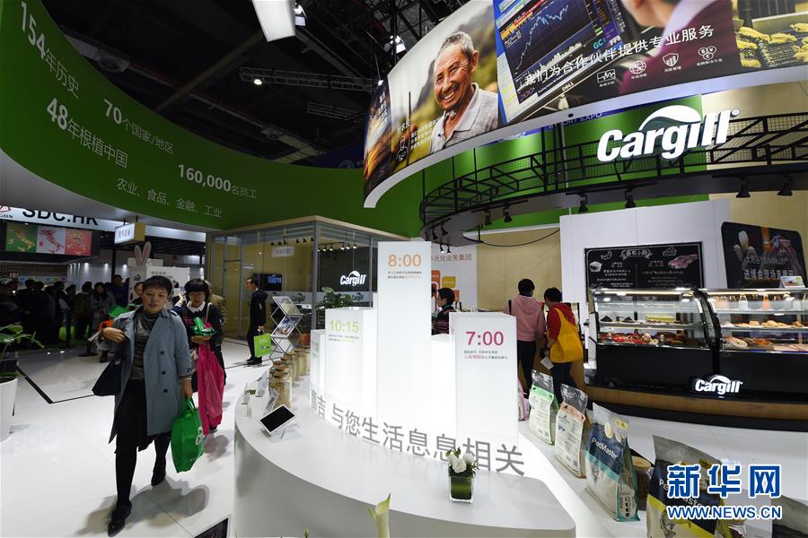 11月10日,在第二届进博会食品及农产品展区,参观者在美国嘉吉公司展台参观。新华社记者范培珅摄