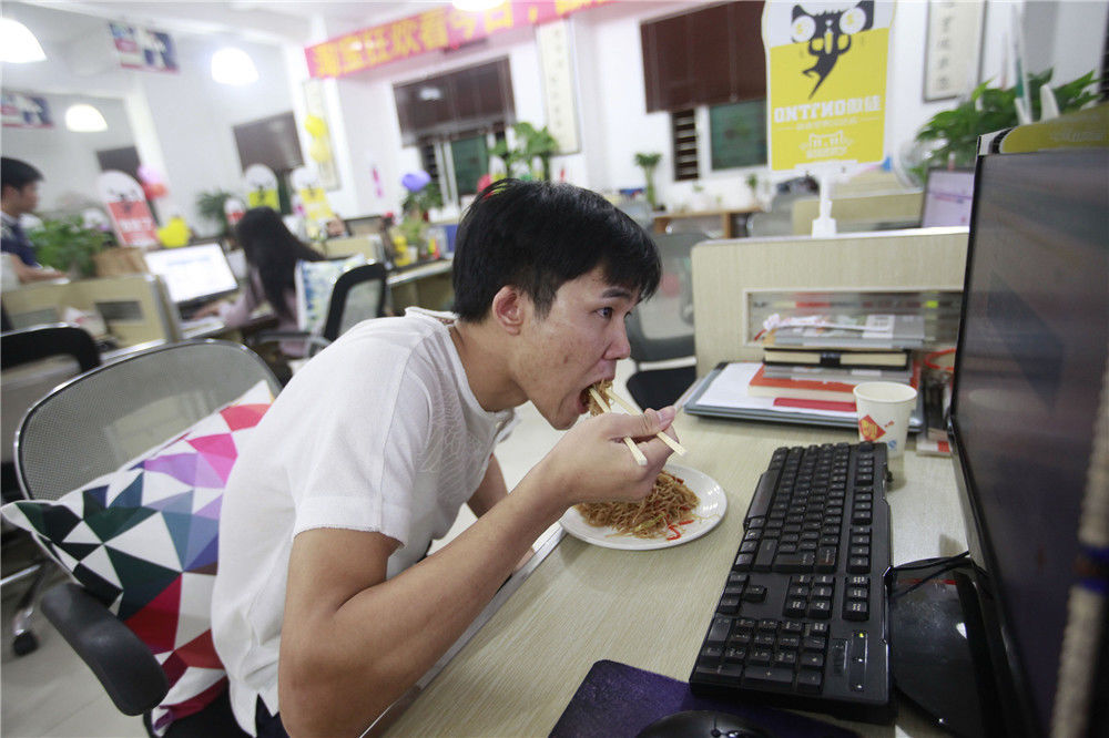 2015年11月11日,东莞市依唯尔服饰公司,熬通宵的客服吃夜宵时间还要盯着电脑。方光明/视觉中国