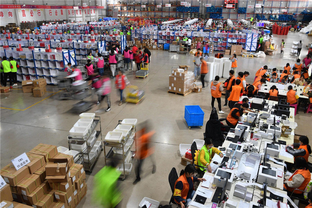 2019年11月11日,工作人员在仓库忙碌。当日,“双十一”购物节正式启幕,企业开始迎来打包发货高峰。在昆明薇诺娜化妆品的仓库里,每个班次有1000余人在岗位上忙碌,进行拣货、打包、验单等工作,以保证每一件订单能最快送到消费者手中。