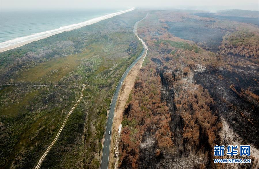 这是11月11日航拍的澳大利亚新南威尔士州麦夸里港附近的过火林地(右)。新华社记者白雪飞摄
