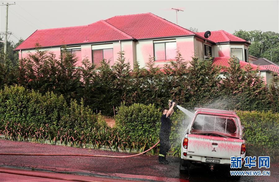 11月12日,在澳大利亚悉尼附近的南塔勒马拉,消防员在灭火后清洗车辆上的灭火剂。新华社记者白雪飞摄