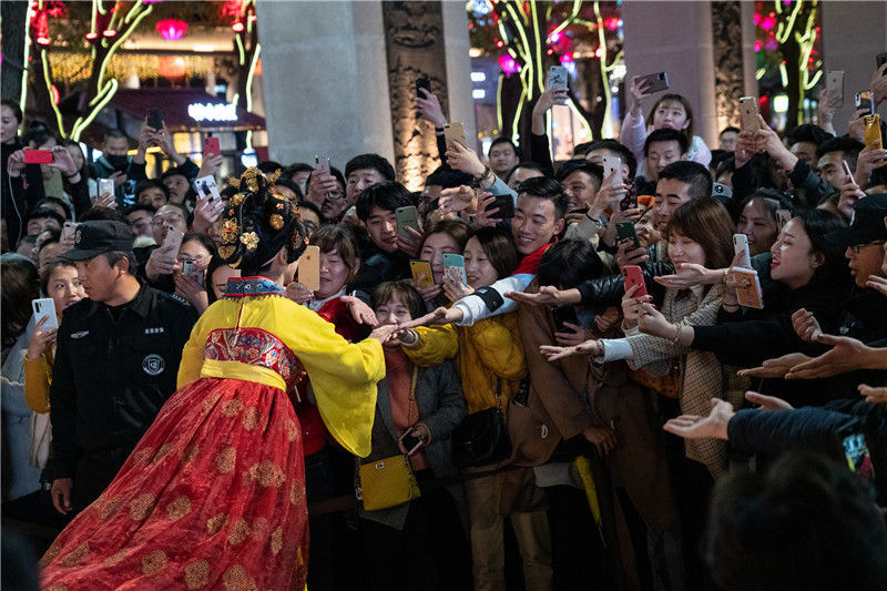 大唐不夜城“真人不倒翁”成网红 吸引游客前来跟小姐姐握手