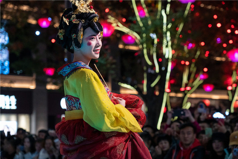 2019年11月12日,西安,大唐不夜城“真人不倒翁”表演,吸引了众多游客前来拍照打卡。