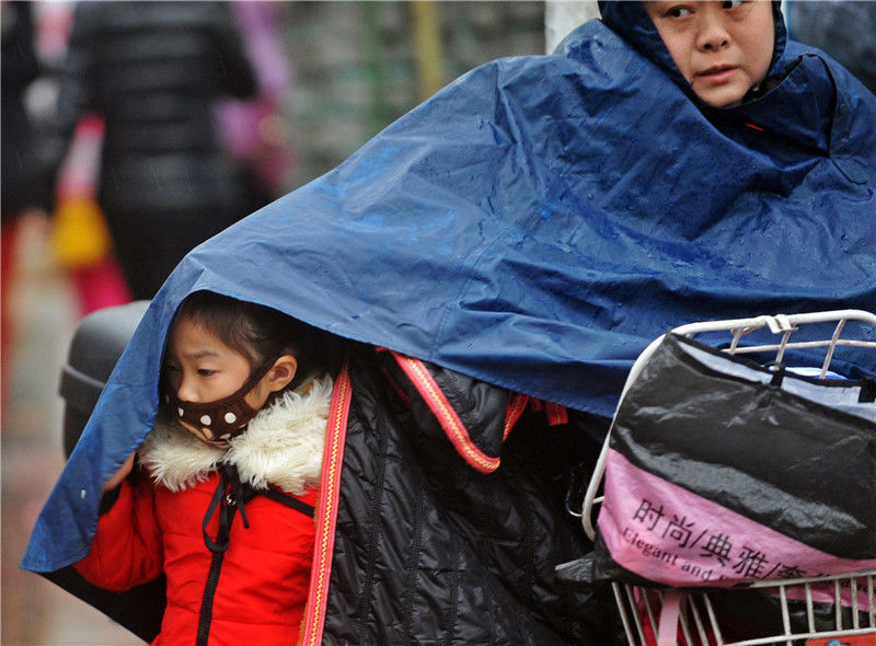 2016年11月22日,武汉街头,一位小女孩从挡风御寒的雨衣中钻出,准备步入校园。苗剑/视觉中国