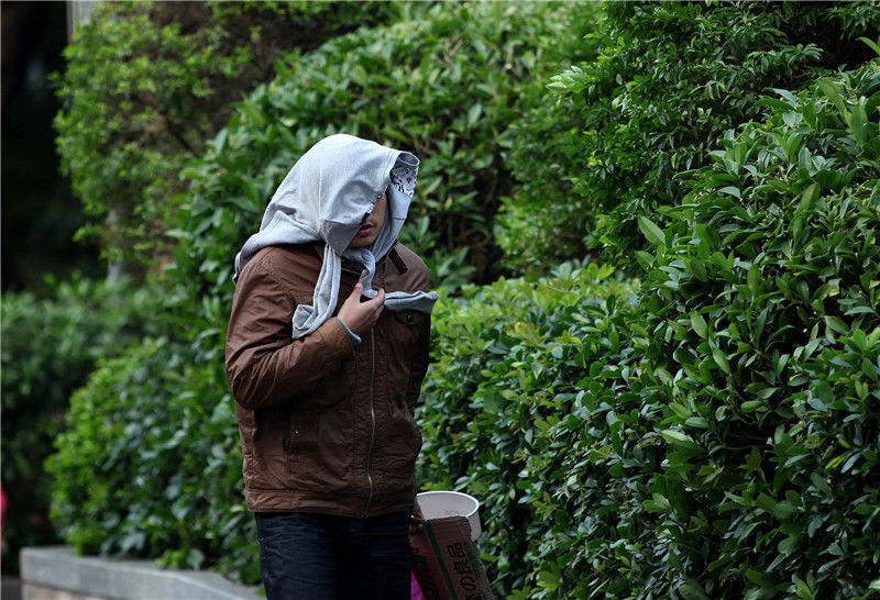2014年12月16日,广州连新路,一个市民用衣服裹头抵御寒风。冯宙锋/视觉中国