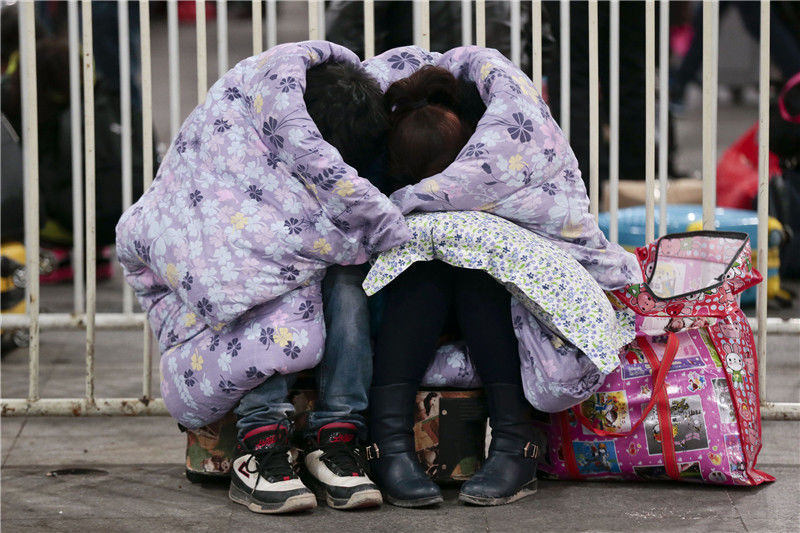 2016年1月25日凌晨4时50分许,在广州火车站广场候车棚,两口子裹在被子里御寒。黎湛均/视觉中国