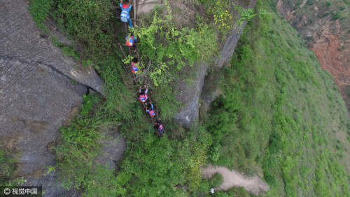 四川省凉山彝族自治州昭觉县支尔莫乡阿土勒尔村,是一座名副其实的“悬崖村”,72户人家居住在这里,处于美姑河大峡谷断坎岩肩斜台地,海拔1400多米,与地面垂直距离约800米。5月14日,放学路上,孩子们在攀爬藤梯。 图片来源:视觉中国