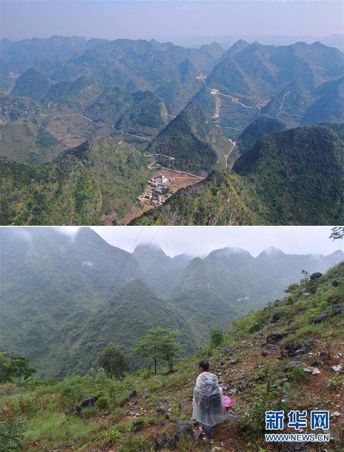 拼版照片:上图为刚刚修通公路的大化瑶族自治县板升乡八好村弄麻屯(11月11日无人机拍摄);下图为在尚未通路的八好村弄麻屯,孩子们爬山路回家(2016年9月23日摄)。新华社记者 黄孝邦 摄