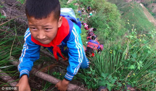 上学的孩子都背着沉沉的书包,大多数是女孩,15个孩子在三个家长的保护下,大约用了2个小时,到达“悬崖村”。上山容易下山难,遇到雨雪天气,村里人就不再外出了。 图片来源:视觉中国