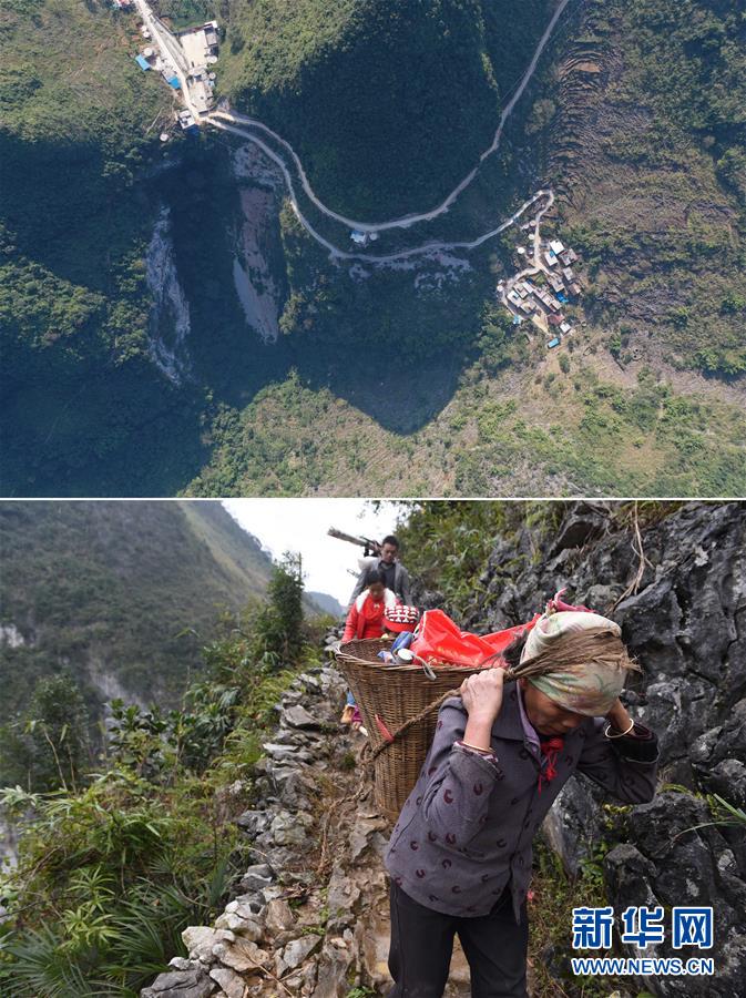拼版照片:上图为已经修通水泥路的大化瑶族自治县板升乡八好村八好屯(11月11日无人机拍摄);下图为在尚未通路的八好村八好屯,村民背着年货走山路回家(2016年1月26日摄)。新华社记者 黄孝邦 摄