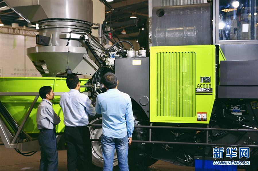11月16日,参观者在展会现场参观甘蔗收割机械设备。
