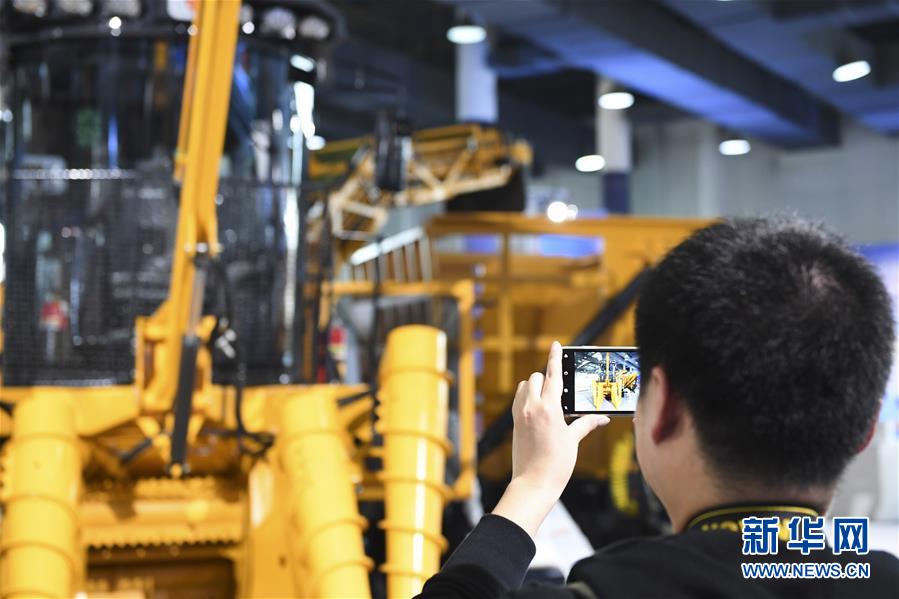 11月16日,参观者在展会现场参观甘蔗收割机械设备。新华社记者曹祎铭摄