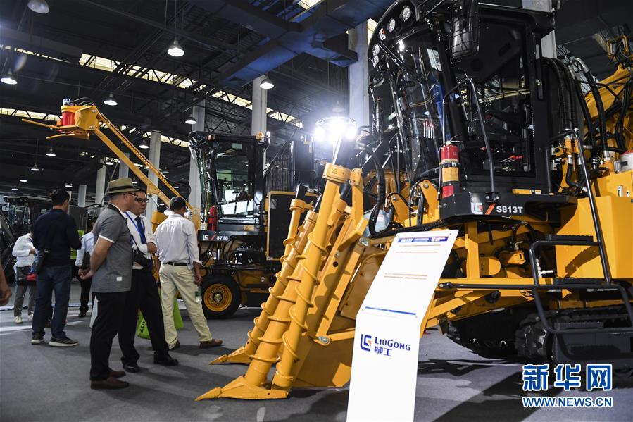 11月16日,参观者在展会现场参观甘蔗收割机械设备。新华社记者曹祎铭摄