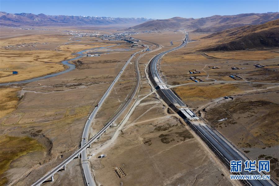 西藏当雄县城附近,青藏铁路、国道和即将完工的公路并行(10月28日摄)。新华社记者江宏景摄